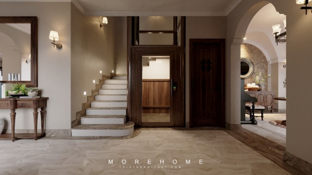 Lối đi lên tầng nhà phố, biệt thự trang trí nội thất hiện đại màu nâu trầm ấm cúng