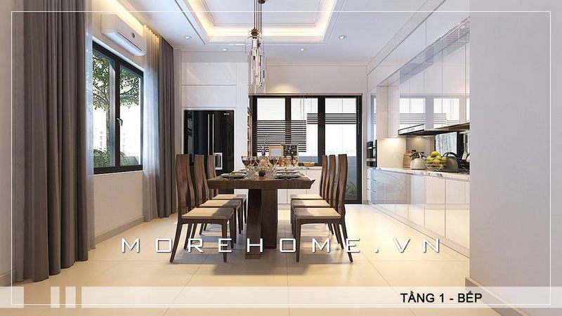Mẫu bàn ăn mặt đá hoa cương màu trắng sang trọng, được thiết kế 6 ghế gỗ hiện đại tiện nghi và sang trọng cho phòng ăn biệt thự