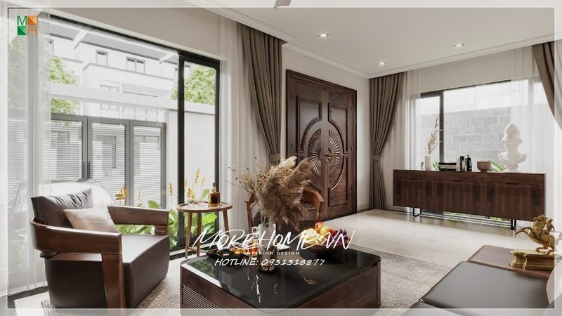 Vẻ đẹp sang trọng của mẫu thiết kế phòng khách biệt thự hiện đại được tạo nên bởi sự kết hợp của ba chất liệu: đá, kính và gỗ óc chó cao cấp.