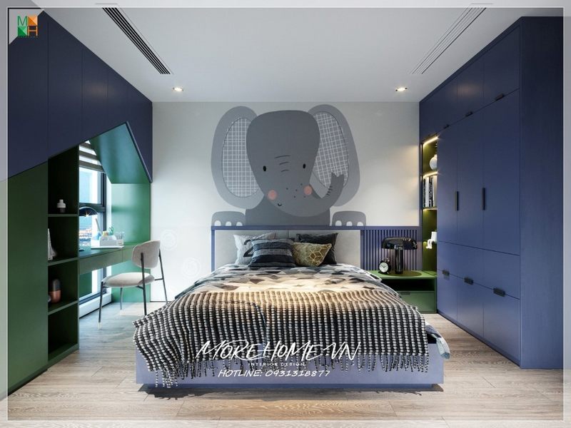 Mẫu thiết kế phòng ngủ cho con với bàn học và nội thất gỗ công nghiệp.