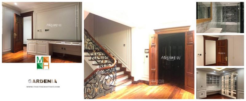 Cầu thang gỗ sắt tân cổ điển là một phần trang trí thẩm mỹ sang trọng cao cấp để tô điểm cho không gian.