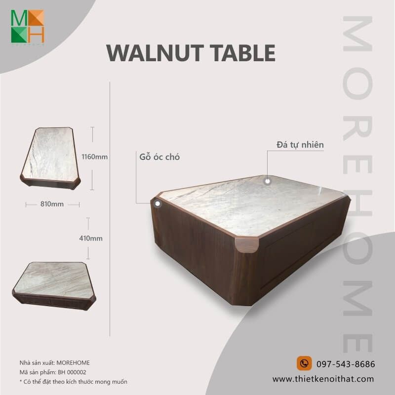 Mẫu bàn trà bằng gỗ óc chó cao cấp, có mặt bàn đá nhân tạo vân mây hình hộp không chân, mang lại cảm giác mới mẻ và phù hợp với phong cách hiện đại của phòng khách.